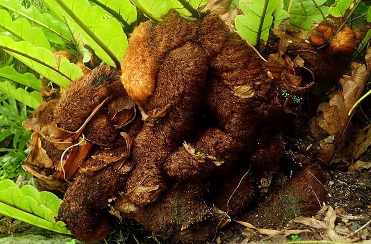 Phần thân rễ là bộ phận có giá trị dược liệu của cây Cốt toái bổ. Chúng có hình dạng củ, cong queo với nhiều phân nhánh. Những rễ già thường có màu nâu sậm, phần thân rễ mẫm, bóng và tương đối cứng, dài từ khoảng 5-15cm, rộng 1-2cm. Chúng được bao phủ bởi 1 lớp lông vảy màu vàng hoặc nâu vàng, có độ óng và khá dễ rụng.