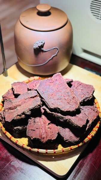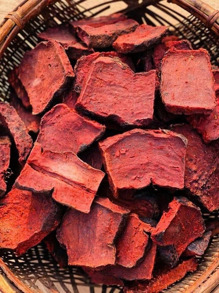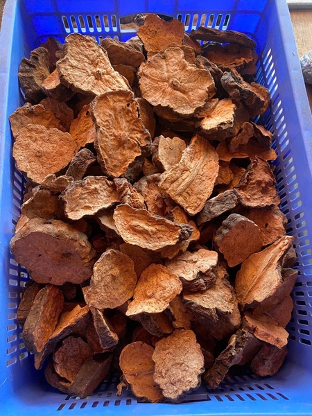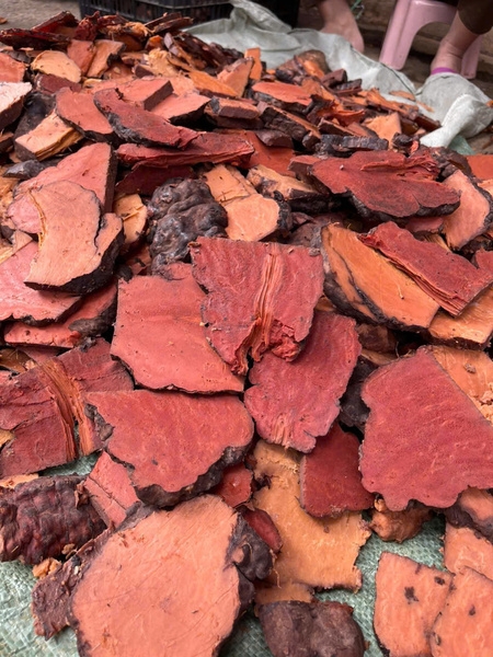Mặt cắt ngang có lớp bần mỏng màu nâu sẫm, mô mềm vỏ màu đỏ hồng, có nhiều bột, ở giữa có ít lõi gỗ. Vị chát..